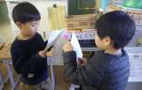 国語科「むかしばなしを よもう」で、図書室で選んだ昔話の本を友達に紹介する学習...