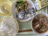 今日の献立は、ごはん、鯖の銀紙焼き、はりはり和え、冬瓜スープ、梨、牛乳です。 ...