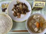 今日の献立は、ごはん、ほたての香味焼き、もずくのチャプチェ、ごまけんちん、黒糖...