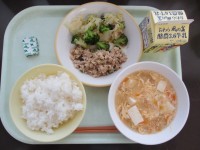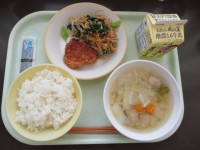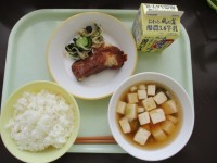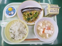 今日の献立は、ごはん、豚肉の香り揚げ、いり大豆和え、つみれ汁、のり佃煮、牛乳で...