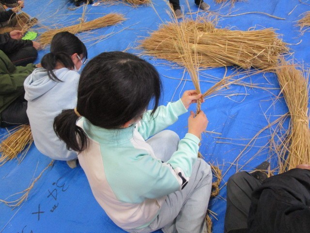 初めは難しくて苦戦していた子供たち。地域の方々に教えてもらいながら進めることで、段々とコツをつかみ、夢中になって縄を編む子供の姿が見られました。