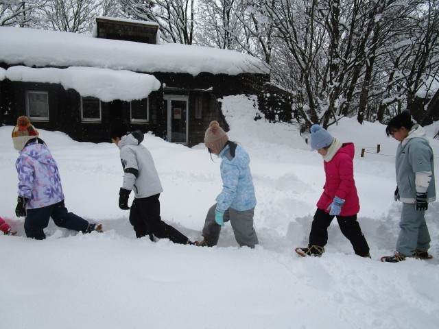 ねいの里の見学に行きました。かんじきを履いて、雪の上を歩きました。「歩くたびに音が鳴って楽しい」「誰も通っていない道を通りたい」と話しながら、新雪の上をどんどん進んでいった子供たちでした。