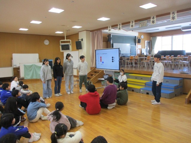 音川タイムでは、なかよし班ごとに6年生が提案した「ジェスチャーゲーム」を行いました。「下級生と交流する機会をつくり、もっと仲を深めたい」という6年生の思いから実施しました。卒業に向けて、自分にできることを考えて行動しようとする頼もしい姿が見られました。