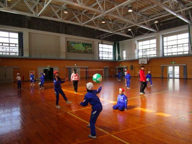 体育科で、ビーチボールを使ってキャッチバレーの学習をしています。パスが続けられるように