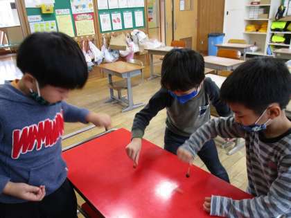 生活科の時間、見付けた秋で何をしようか、計画を立てました。さっそく、材料をもってきてどんぐりごまをつくる子供たち。休み時間にこまを回して勝負していました。