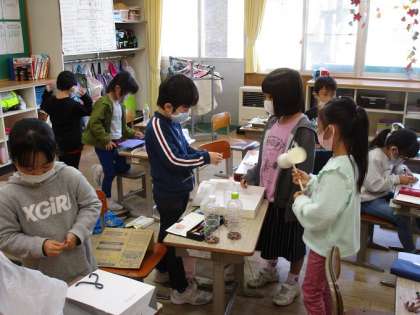 生活科「あきでつくろう、あそぼう」では、どんぐりや落ち葉を使って、こまやけん玉、迷路やはり絵など、思い思いのものをつくっています。今はまだつくることに夢中の子供たちです。