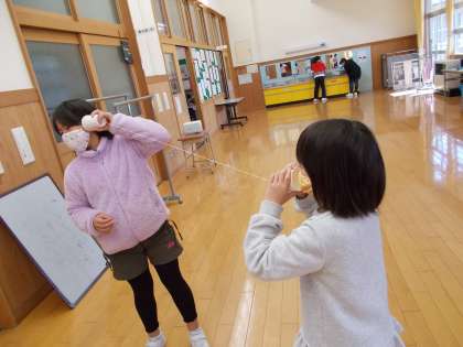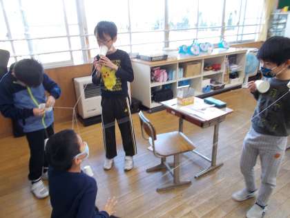 3年生は理科の時間に音の伝わり方の学習をしました。糸電話を使って、音が伝わるとき、伝わらないときを調べたり、糸のふるえを触ったりしました。男子は糸をつなげて何やらおもしろそうなことをしています。