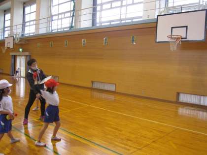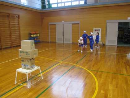 ボール投げの練習をしました。ドッジボールやお手玉を、段ボールの的やバスケットゴールのボードに向かって投げました。的を倒そうとよく狙って投げています。だんだん遠くからでも、的に当たるようになってきました。