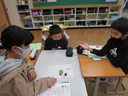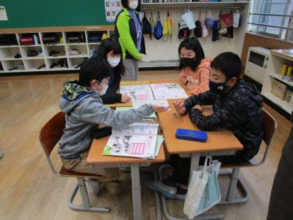 今日の外国語の学習は、今まで習ったことの復習を双六で行いました。出たマスに合った文章の言い方や発音を確認しました。楽しみながら、確認していました。