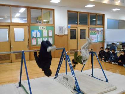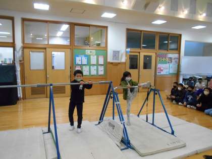 第2回パフォーマンス大会。1年生も鉄棒の技を披露しました。見ている子供たちも、大きな拍手をしたり歓声を上げたりしながら、大盛り上がりでした。