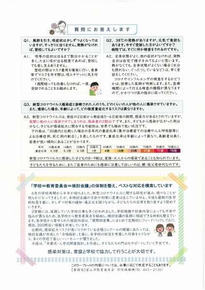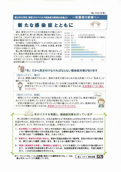 富山市教育委員会より、「新型コロナウイルス感染症対策検討会議便りVOL.7」が届きました。「冬の感染症対策」「新型コロナウイルス感染症に関する質問への回答」等の記事が掲載されています。本日子供たちに配付しましたので、ご確認ください。