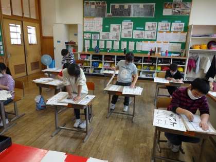 書初めの練習を始めました。2年生は、硬筆で「はつ日」を書きます。3回目の今日は、本番で使う紙を使って書きました。なかなかの出来映えでしたが、「はを形よく書きたい」「名前を上手に書きたい」など、もっと上手に書きたいと意欲満々の子供たちでした。