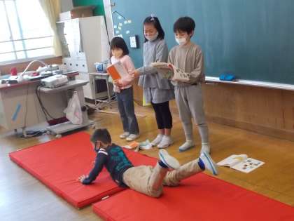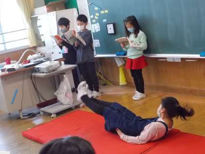 3年とうげの音読発表会をしました。自分たちでマットを持ってきて、おじいさんになりきって身体を動かしながら発表していました。