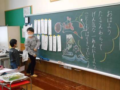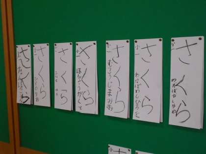 1年生の子供たちにとっては、初めての書初大会です。硬筆墨を使って、堂々と「さくら」と書き上げました。書き終わると、うれしそうに自分たちの書き初めを眺めていました。