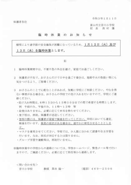 本日、富山市教育委員会より積雪による臨時休業の連絡が届きました。臨時休業は、1月12日(火)と1月13日(水)です。詳しくは、下の文書をご確認ください。