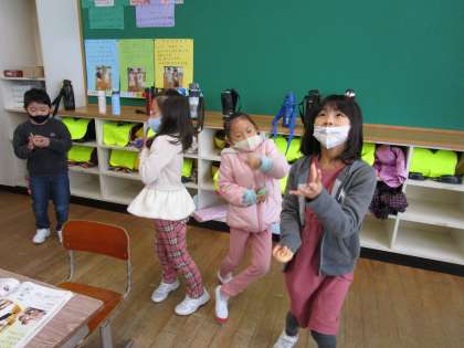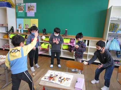 今日は、寒い日でも楽しく遊ぶことのできる「けん玉」「ヨーヨー」「お手玉」に挑戦しました。上手に続ける「コツ」を知っている子供もいて、教え合いながら楽しく取り組みました。