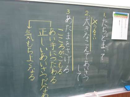 1月の生活目標「相手の目を見て、さわやかなあいさつをしよう」について話し合い、1年生の目当てを決めました。「立ち止まって、大きな声で挨拶して、頭を下げよう」と決まりました。「心」を伝える行動について考えました。
