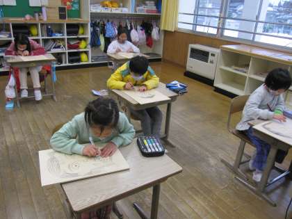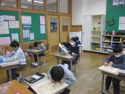 3年生は初めて彫刻刀を使いました。けがをしないように使い方に気を付け、集中して取り組みました。