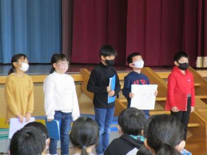 感謝の集いが行われ、2年生は、入学してから自分ができるようになったことを発表して、いろいろな方にお世話になったことへの感謝の気持ちを伝えました。また、3〜6年生が地域の方に教えていただきながら活動した発表を聞き、自分たちも、これから取り組めることを楽しみにしていました。