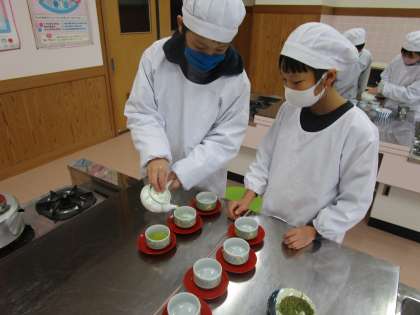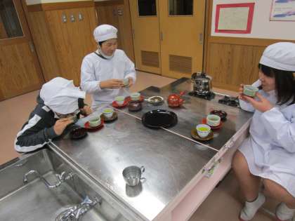 ガスコンロを安全に使ってお茶を入れました。自分たちの入れたお茶をおいしく味わいました。