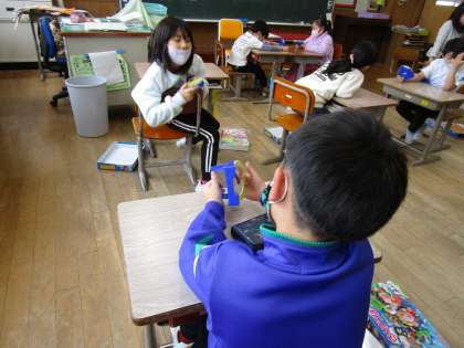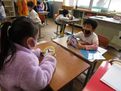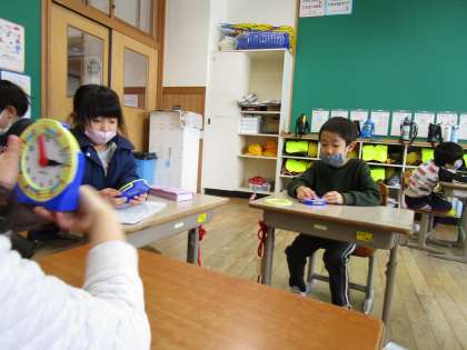 算数科の学習「なんじなんぷん」では、模型時計を使って、短針と長針の関係を捉えて時刻の読み方を考えたり、時計盤の目盛りに着目して長針の読み方を考えたりしています。友達と問題を出し合い、「なんじなんぷん」に慣れ親む練習を繰り返しています。
