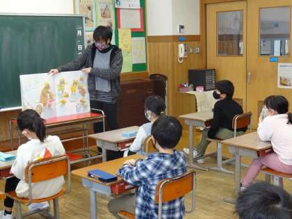 大かぶの会の方に、大型絵本「ねずみのさかなつり」を読んでいただきました。迫力のある絵本と、楽しい話に、子供たちは夢中になって聞いていました。今年もたくさんの本の読み聞かせをしていただき、ありがとうございます。