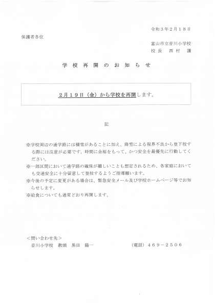 本日、富山市教育委員会より学校再開の連絡が届きました。明日、2月19日(金)より学校を再開します。給食についても通常通り再開します。