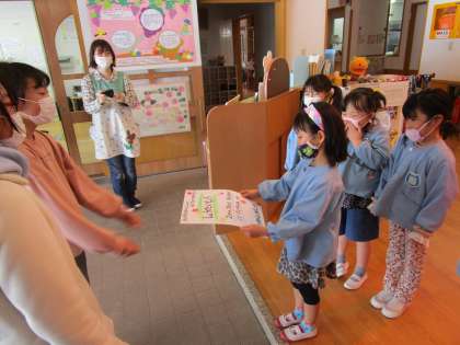 保育所に招待状を渡しに行きました。5年生は、保育所園児が学校を好きになってもらえるように準備をがんばっています。