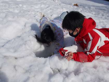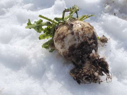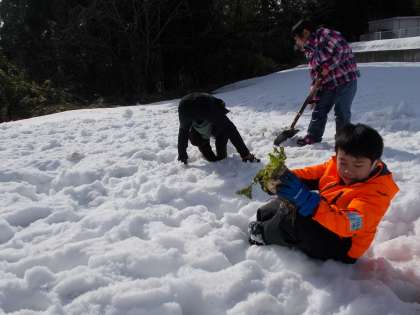 3年生は、雪が60m以上積もった畑まで行くことに成功しました。しかし、大かぶを掘り当てるのが難しく、苦戦しました。なんとか数個大かぶを収穫することができました。本当に雪の下で甘くなっているでしょうか。