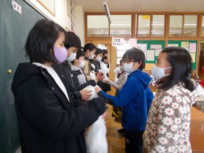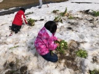 3年生は卒業おめでとう集会の出し物と別にもう一つ6年生への感謝の気持ちを込めたプレゼントを考えていました。それは、とれたての大かぶをプレゼントすることです。雪が溶け、収穫しやすくなった大かぶを収穫し、プレゼントすることができました。