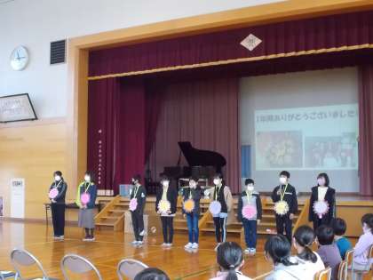 今日は、卒業おめでとう集会でした。1〜5年生の心のこもった出し物で、6年生はうれしそうでした。最後に6年生が感謝の言葉を伝えました。