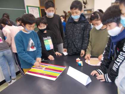 3年生は理科や図工の時間に作った作品を全校に楽しんでもらうために、おもちゃランドを作りました。全校のみんなと一緒に楽しく遊ぶことができました。