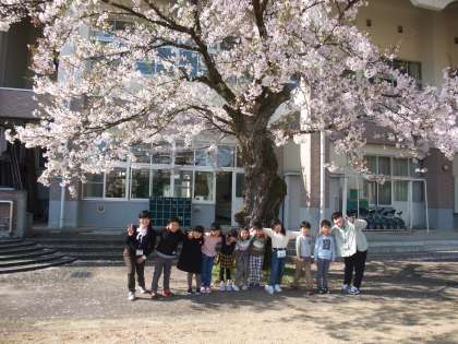 1年生は桜の木の下で集合写真を撮りました。ほかの桜の木は花が散ってしまい、葉桜なのですが、1年生教室の横の桜の木だけはまだ咲いていて、子供たちは「入学を待ってくれていたのかな」と話していました。1年間よろしくお願いします。