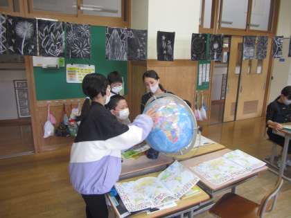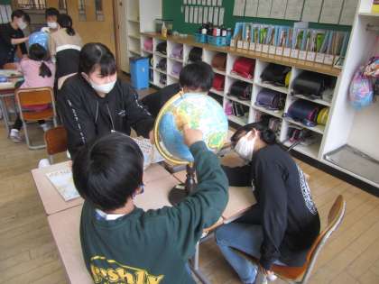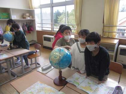 社会科では、地球儀や地図を使って学習しています。今日は地球儀の中に日本やアメリカなどの国がどこにあるのかを探すゲームをしました。地球儀を回しながら一生懸命お題に合った国を探す子供たちでした。