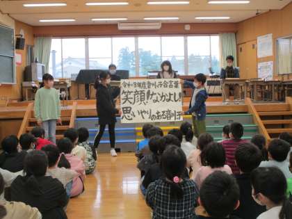音川小学校の今年度の合言葉が決まり、運営委員長から合言葉に込められた想いを話してもらいました。
