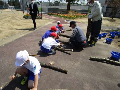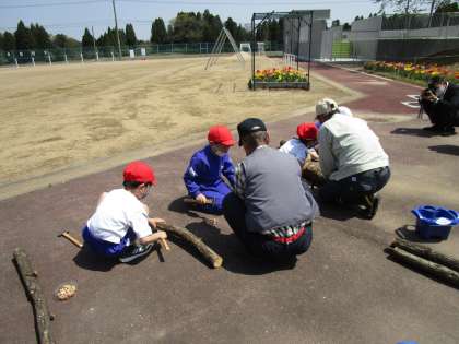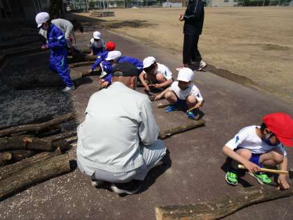 音川交流センター事業の一環として、しいたけの駒菌打ちを体験させていただきました。切り出してちょうどいい長さに切っていただいたコナラの木に、駒菌打ちの穴を開けていただき、一人一人に優しく教えていただきました。「水やりは、どうしたらいいですか」「大きなしいたけを収穫するために何をしたらいいですか」「ほかのキノコは、はえてきませんか」という、子供たちの質問にも丁寧に答えていただきました。来年の秋の収穫が楽しみです。