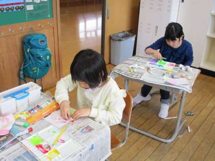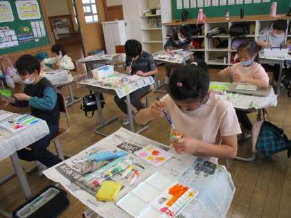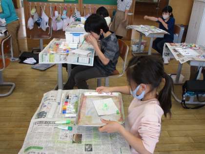 図工の時間、絵の具のいろいろな使い方を試しました。ビー玉に絵の具を付け、ころころ転がしたり、画用紙に垂らした絵の具をストローでふーっと吹いたりしました。