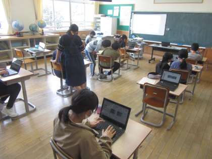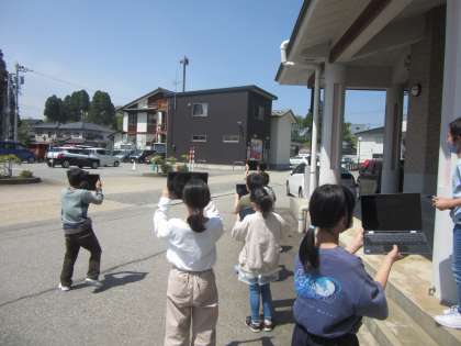 今日は一人1台端末を使って、雲の様子の写真を撮りました。朝とお昼ごろの写真を撮って比べてみました。雲が広がって青空が少し白くなる様子が分かりました。カメラで写真を撮るのは初めてでしたが、既に使いこなしており、図形や文字を入れてまとめることができました。
