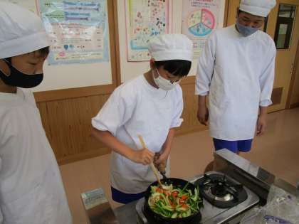 今回の実習では「炒める」調理をしました。野菜や卵を炒めておいしいおかずを作ることができました。また、安全に気を付けて包丁やガスを使用できました。次回も楽しみです。