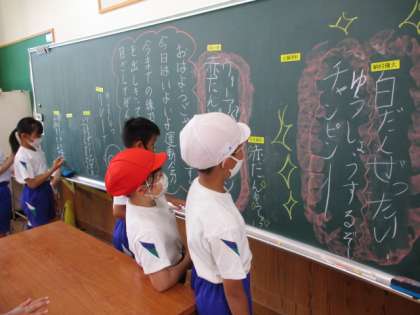 今日は運動会でした。3年生は朝、みんなで黒板に意気込みを書いてグラウンドに向かいました。