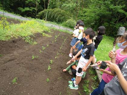 畑にトウモロコシを移植しました。子供たちの蒔いたものの発芽率があまりよくなかったので、予備に蒔いていたものを移植しました。「トウモロコシパーティが楽しみ」と、既に豊作気分です。