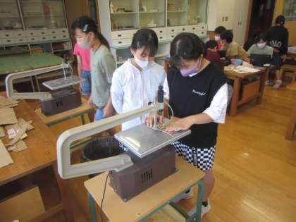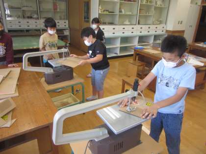 5年生の図工ではオリジナル伝言板を作っています。今日は糸のこを使う練習をしました。最初は素早く動く刃を見て怖がる子供たちでしたが、やってみると不安は少しずつなくなり、波線や星形に切ることができました。