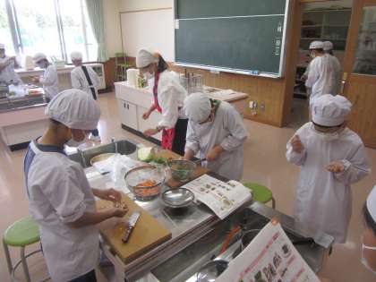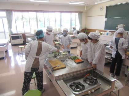 5年生になって家庭科の学習が始まりました。今日は初めての調理実習でした。子供たちは楽しみにしていたようです。野菜を丁寧に切って、ゆで野菜サラダを作りました。自分たちで作ったサラダをおいしく食べることができました。