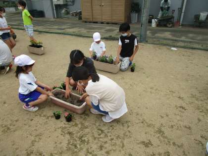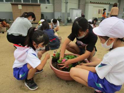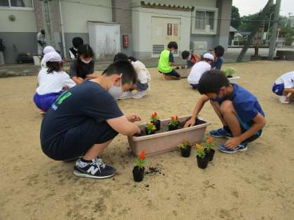 たてわり班で協力し、花の苗を植えました。優しく教えてあげる上学年や、一生懸命きれいに植えようとする下学年等、短い時間でしたが、すてきな姿がたくさん見られました。大きく育つのが楽しみです。