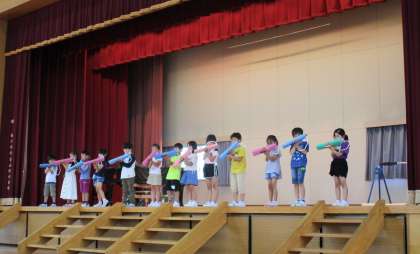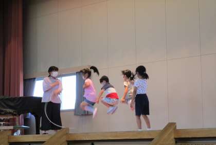 今日は、のびのびタイムに運営委員会主催のパフォーマンス大会が行われました。1・2年生は、なわとびや鉄棒のパフォーマンス、3年生は、担任の先生と二重跳び対決、4・5年生は大歓声の中、得意技を披露したり、担任の先生とスポーツ対決をしたりしました。6年生や音楽科の先生は、個性あふれるすばらしい演技や合奏でみんなを感動させました。