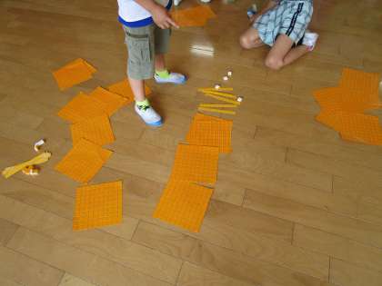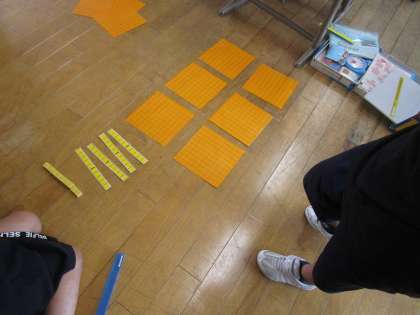 算数科で、100より大きな数の学習をしました。算数ボックスの教材を使って、「○百○十○」の数を作ったり数を読んだりしました。床に並べて、真剣に取り組みました。