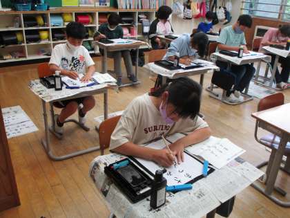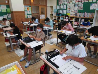 俳句を小筆で書く学習をしています。文字の大きさやバランスに気を付けながら書きました。