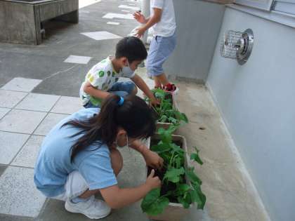あさがおが植木鉢の中で窮屈そうになっていたので、間引きをしました。つるも伸びてきたので、支柱を立て、肥料もやりました。花が咲いたらパーティーを開く計画を立てています。楽しみです。