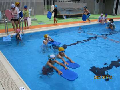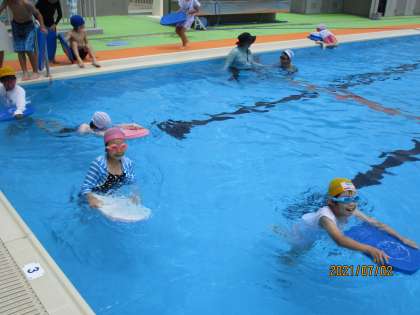 体育の時間、プールに入りました。水の中に顔を付けて「ブクブク、パッ」と息を吐いたり、ビート板を使ってけのびの練習をしたりしました。子供たちは「できるかな」と言いながらも「やってみる!」と挑戦し、「できた!」と歓声をあげていました。やる気満々の子供たちです。