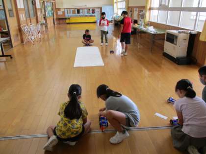 今日は理科でゴムのはたらきをしました。ゴムの伸ばす長さや、ゴムの数で車の動く距離はどう変わるのか、ペアで実験をして結果を出していました。